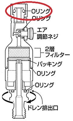 PS282、PS288、PS382、PS388のドレン&ダストキャッチャーのエアブラシ接続側から見えるOリングです。